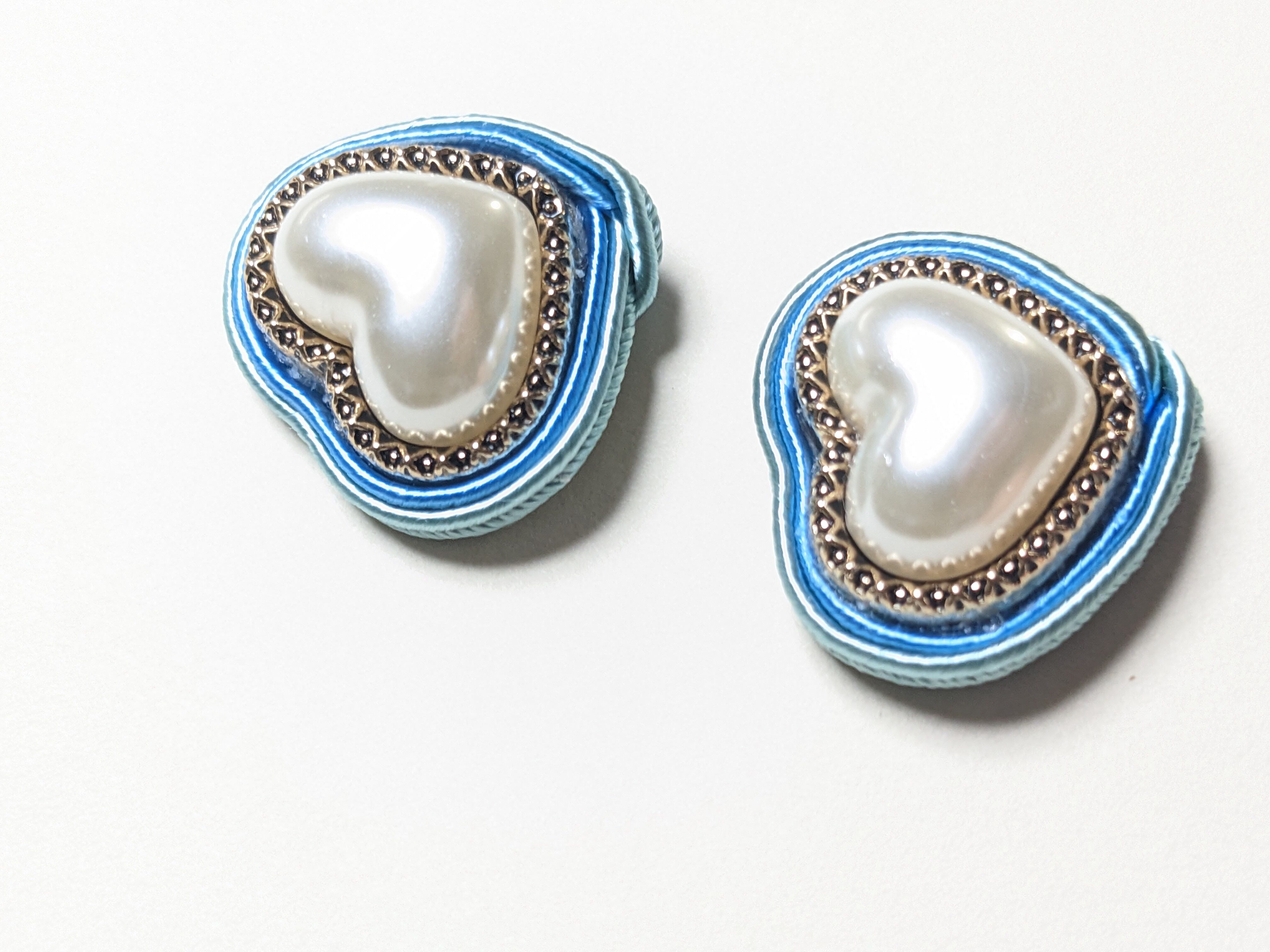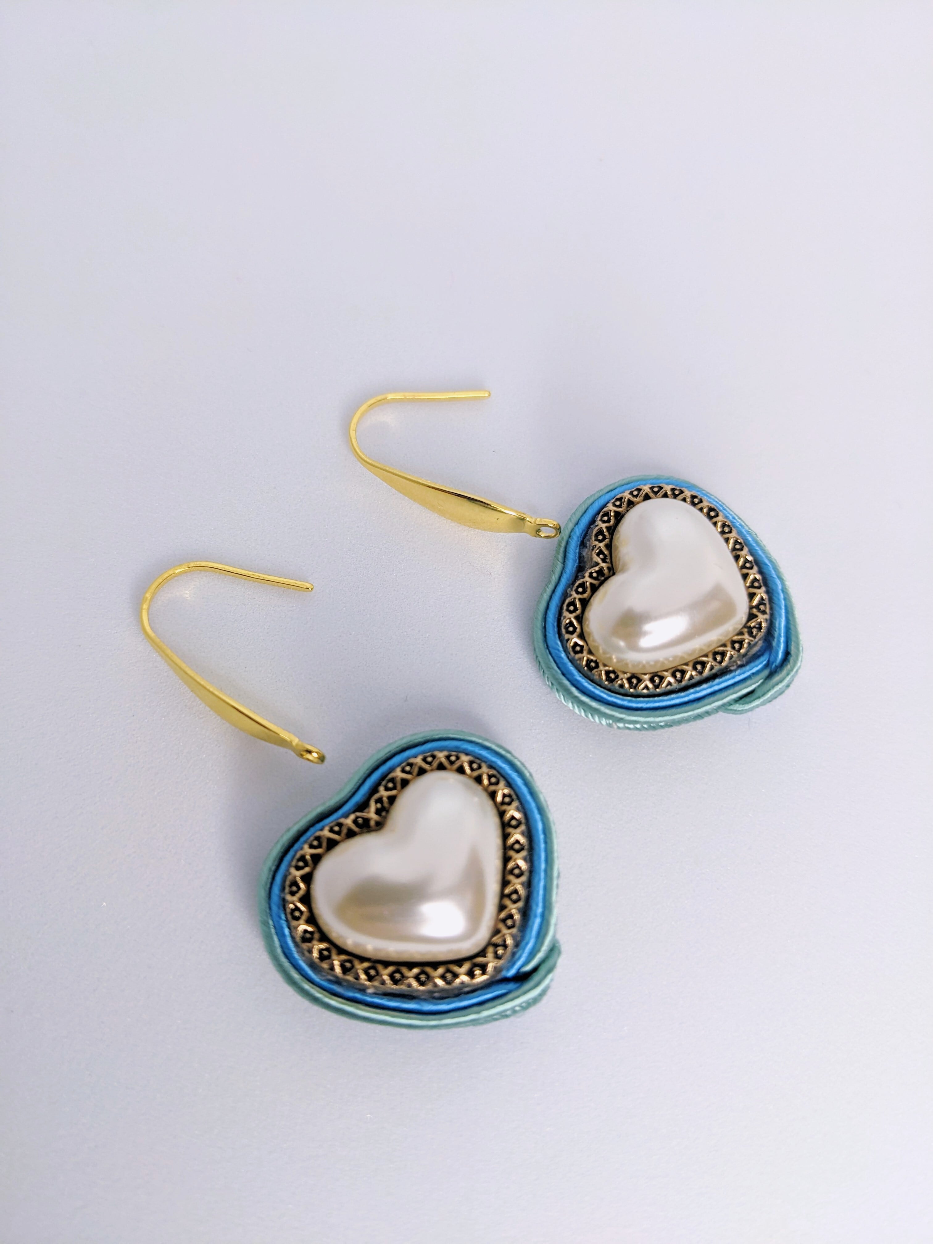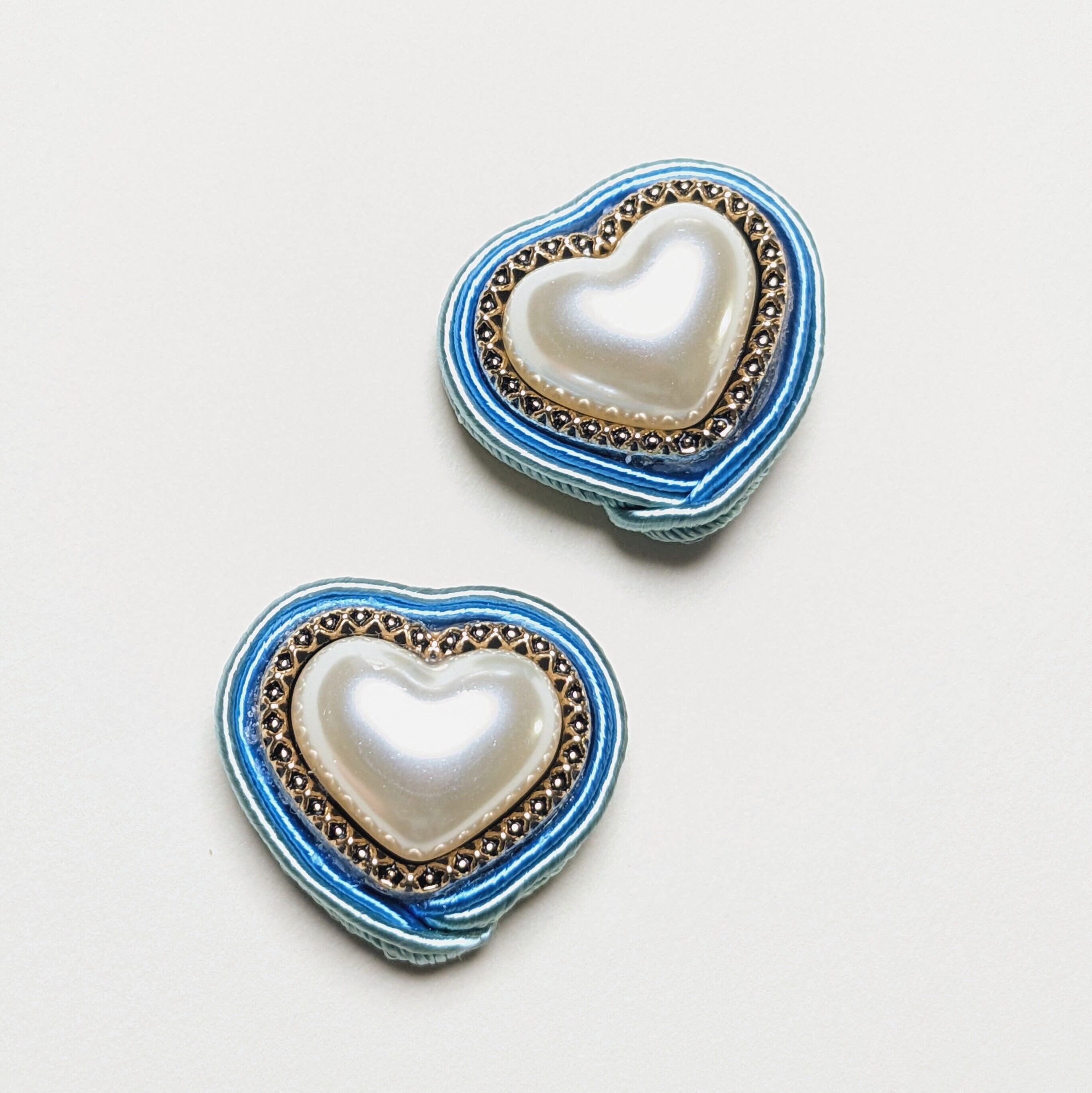◆日差しに温かさを感じるようになり、つい気分も浮つく春がやってきました。こちらは、輸入ボタン素材を使用しています。ぷっくりと厚みのあるパールのハートをヴィンテージ風のゴールドがかっちりとホールド。すっきりとした青みピンクとアンニュイなミストブルーのコードが、移ろいやすい春の陽気を表しています。普段着に薄手のコートを羽織って、手ぶらで青空の下をちょっとお散歩。そんな風にサラリと付けていただくイメージです。 ご希望でフックピアスにも対応できます。