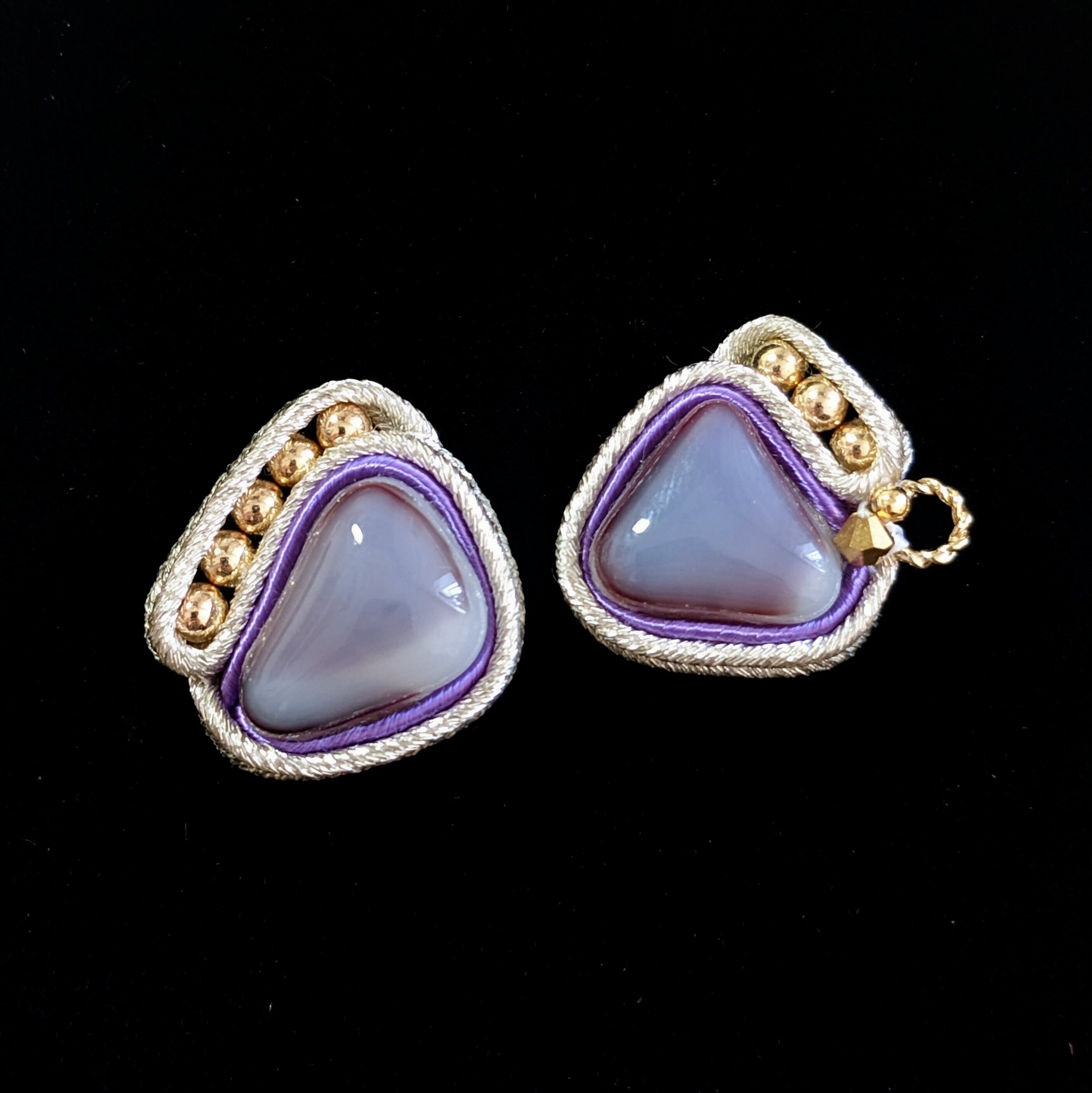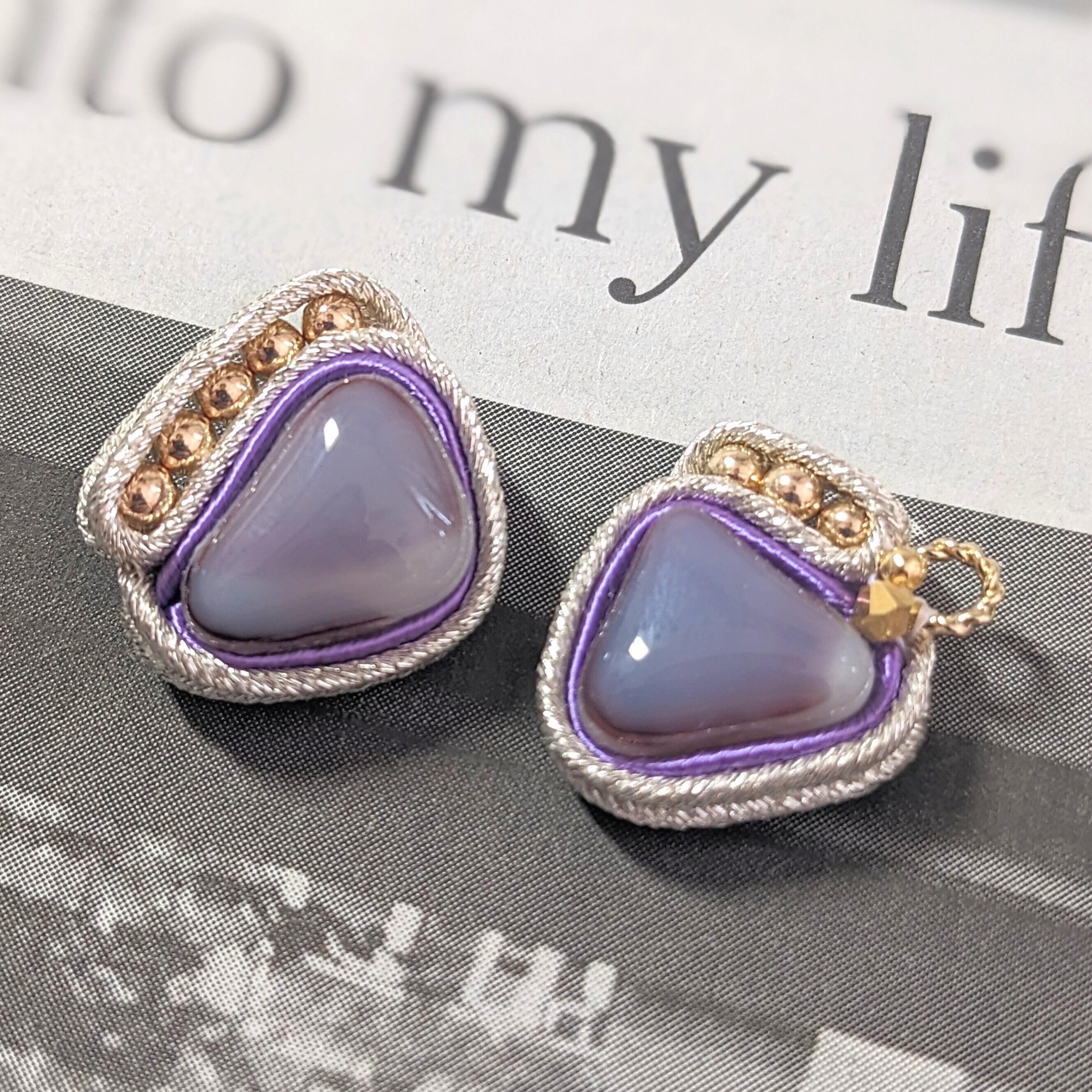 ◆ガラスシリーズ◆心静まる淡く優しい色味のガラスです。「信頼」の色とされる紫とシックな印象を与えるシルバーのコードでまとめました。金色の丸いビーズは両耳合わせて末広がりの8粒。アクセントとして、穏やかさの象徴である「輪」を1つと、「誰もが手にすることができるダイヤモンド」と言われるスワロフスキーを1つあしらいました。