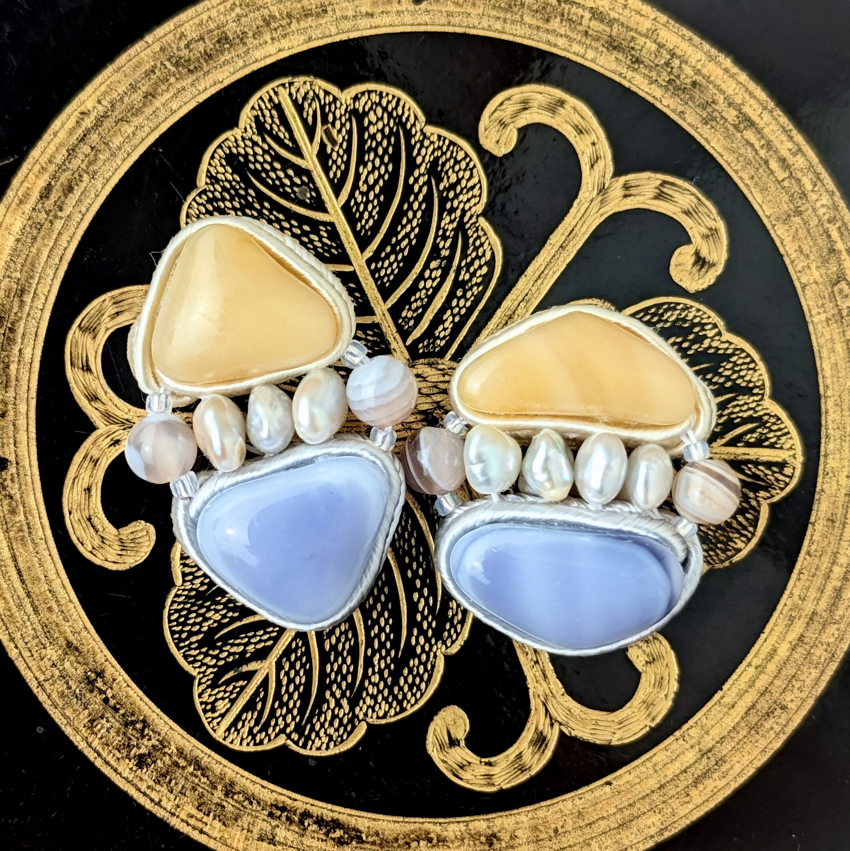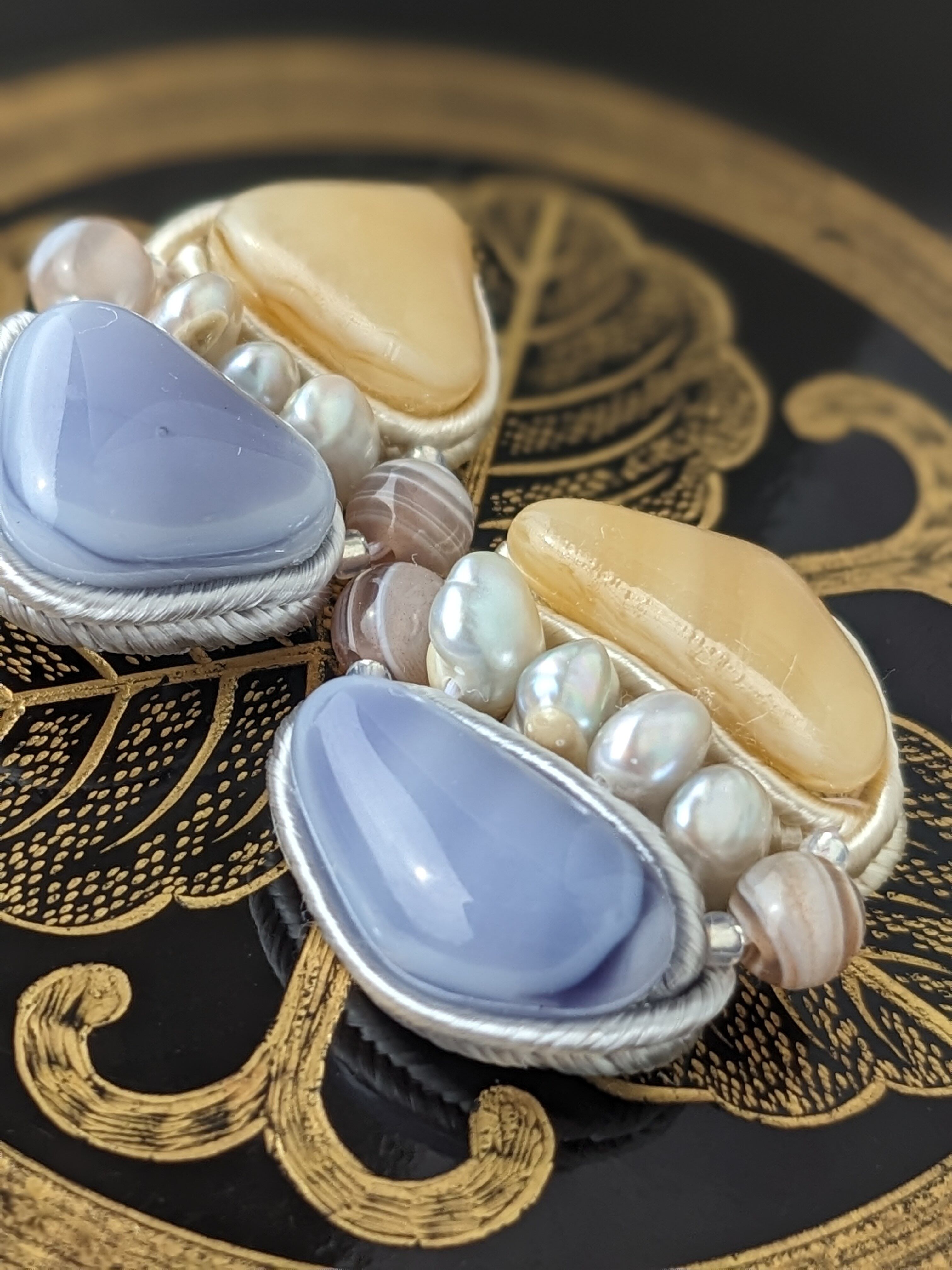◆ガラスシリーズ◆小さなエイリアンの兄弟。シェルっぽいとろみを感じるガラス粒の間に、照りのあるアコヤケシをサンドしてみました。その両脇をかためるのは、天然石ボツワナアゲート。精神と肉体のバランスをとってくれるアースカラーの穏やかな石です。