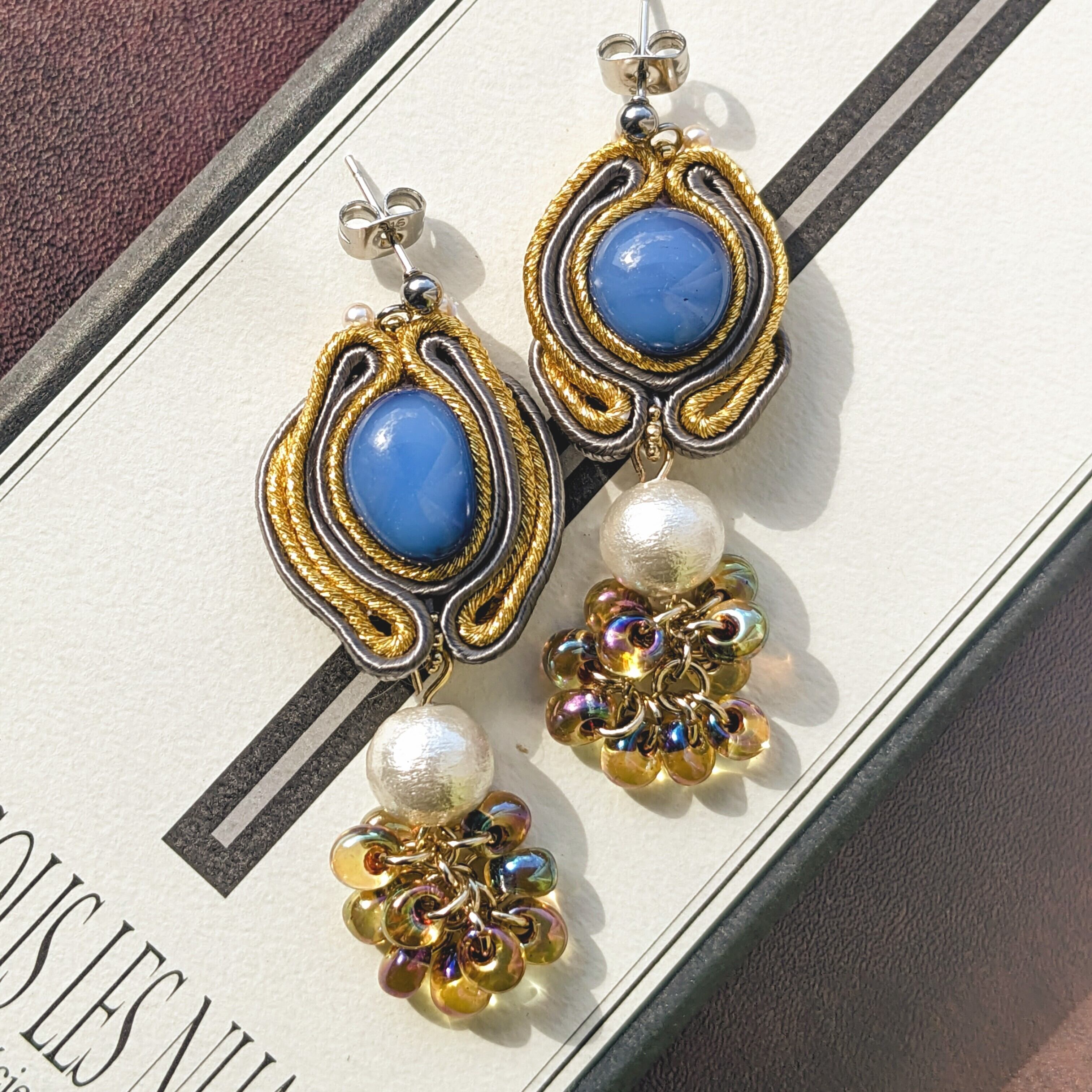 ◆ガラスシリーズ◆シックな色味のガラスに青みグレーとゴールドのコードを合わせました。左右のガラスの個性に応じてコードの巻き方を変えて、幸運を呼ぶと言われる馬の蹄の形を作りました。コットンパールと揺れるオーロラビーズで軽やかな雰囲気に仕上げています。こちらはサージカルステンレスピアスのお作りです。