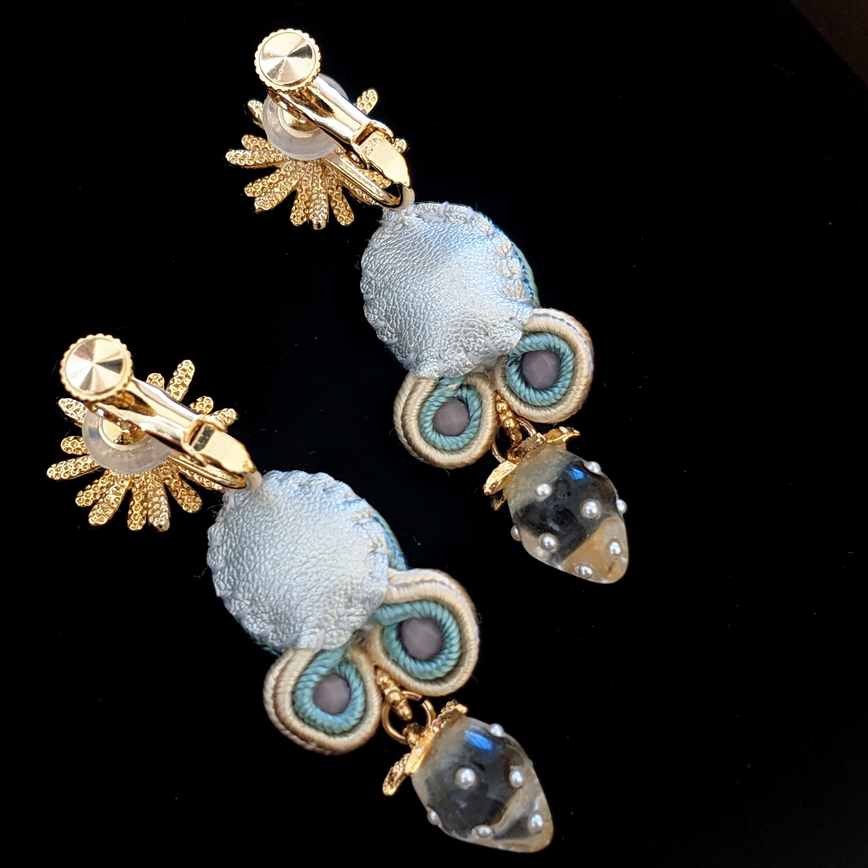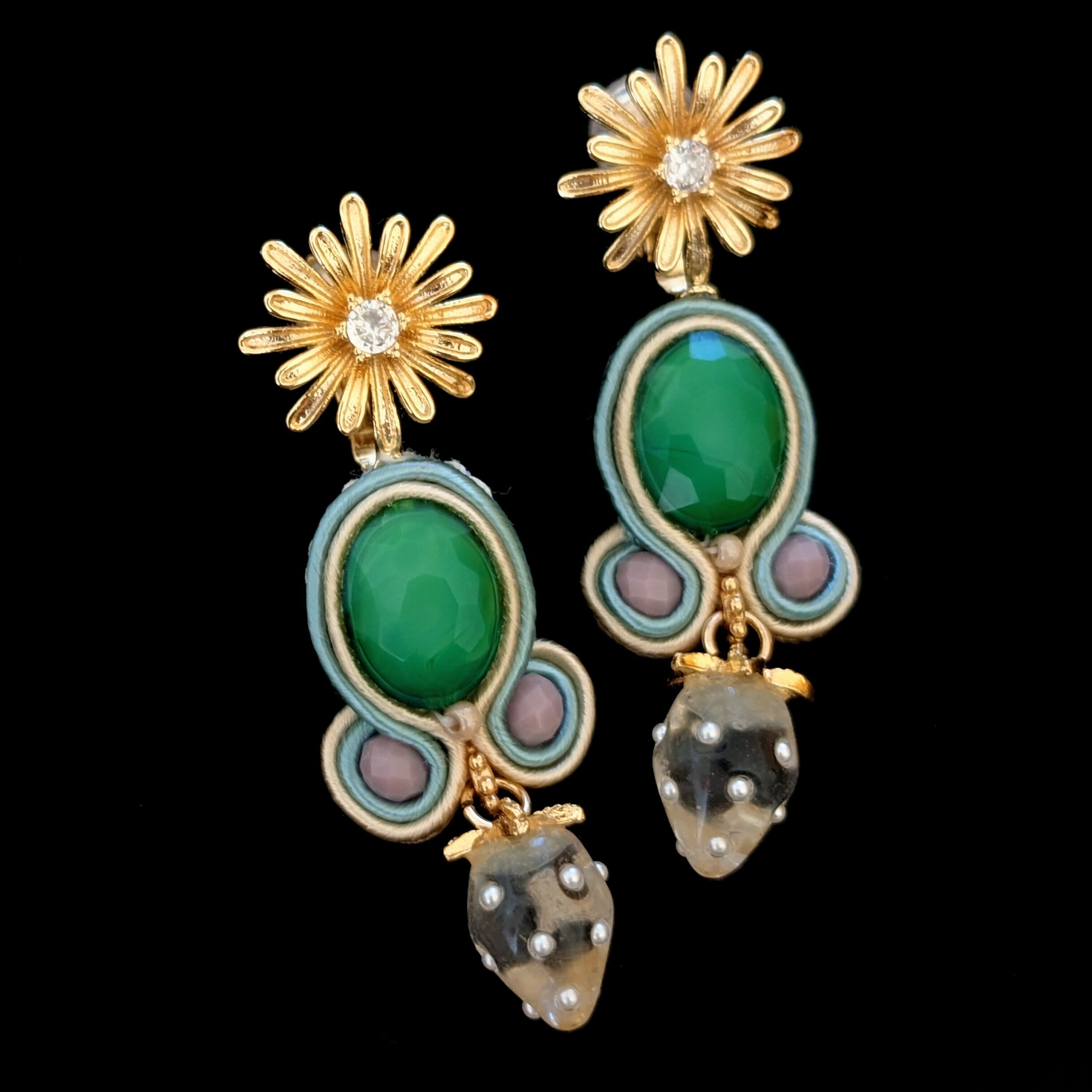 ◆センターのグリーンが印象的な一品。ベージュ×ペールブルーのコードやくすみピンクの小粒ビーズが、主役をより輝かせます。華やかなイヤリングパーツは、全体の重心を上に引き上げてくれます。自立した可愛さを目指した作品です。