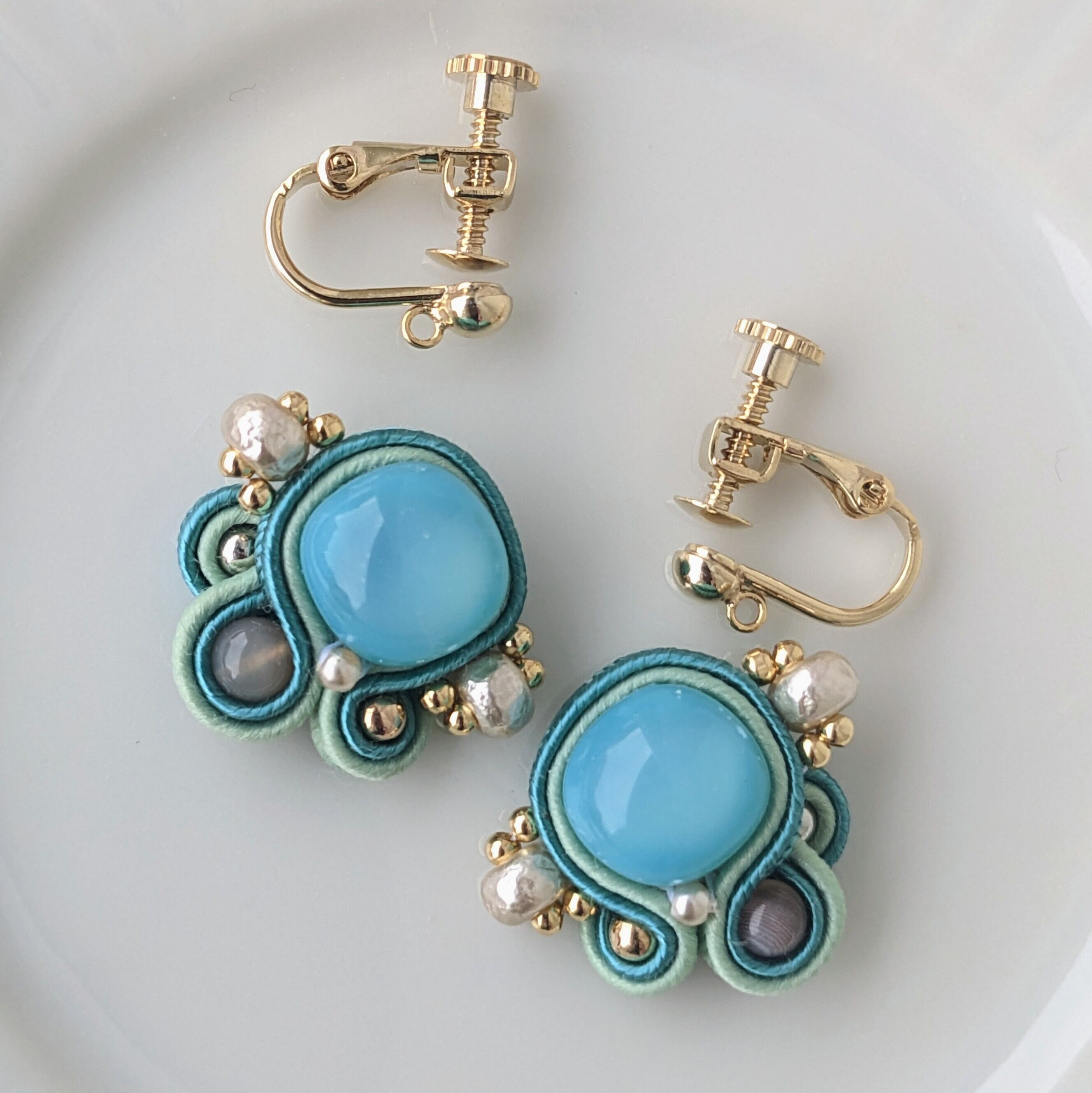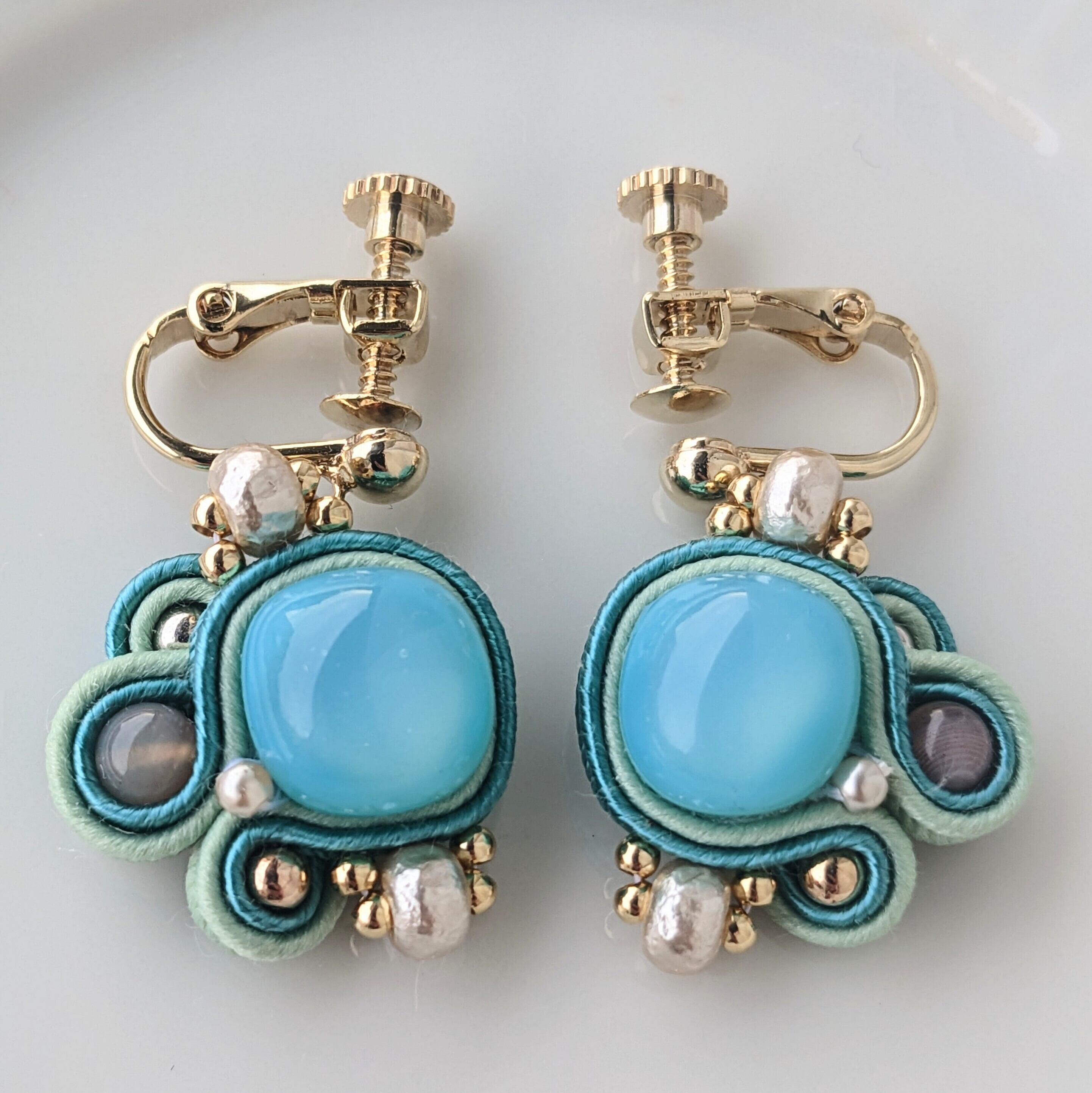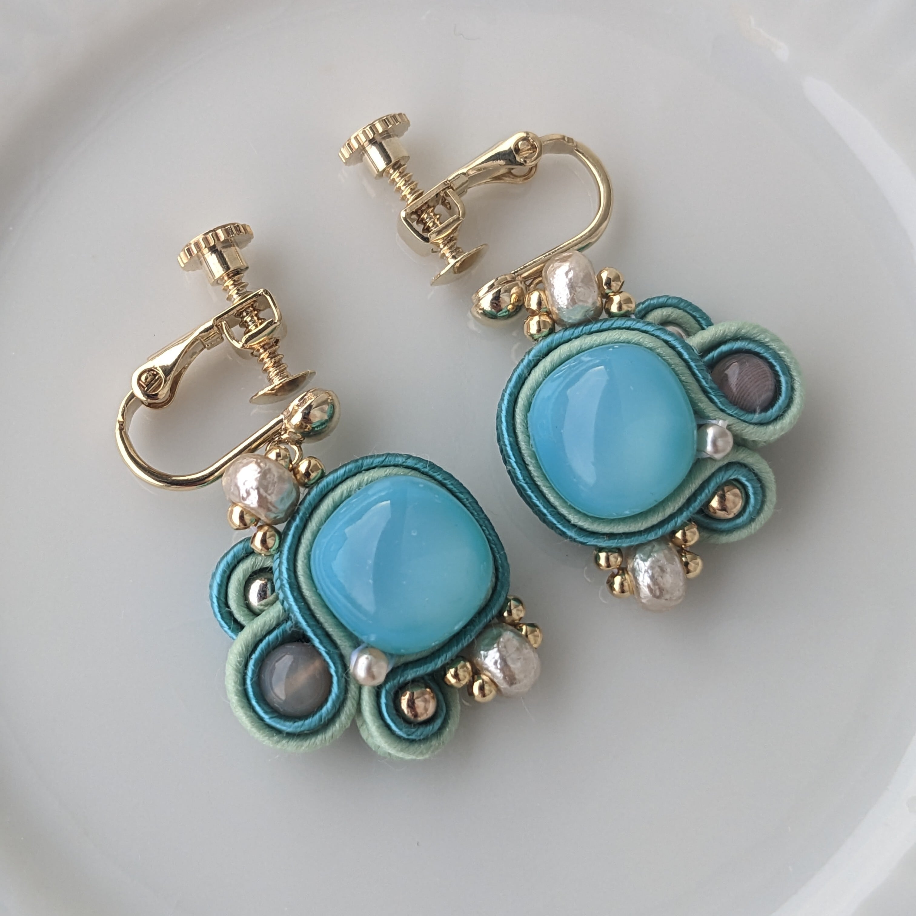 ◆ガラスシリーズ◆紺碧の海岸を意味するコート・ダジュール/Côte d'Azur。そのまま色の名前として存在するほど、象徴的なブルーです。眼下に広がる景色、降り注ぐ日差し、乾いた風や潮の香り…...南仏の憧れをぎゅっと詰め込んだ作品です。豊かさや感謝の気持ちを引き出す、ピンクベージュのボツワナアゲートを一粒ずつ忍ばせています。