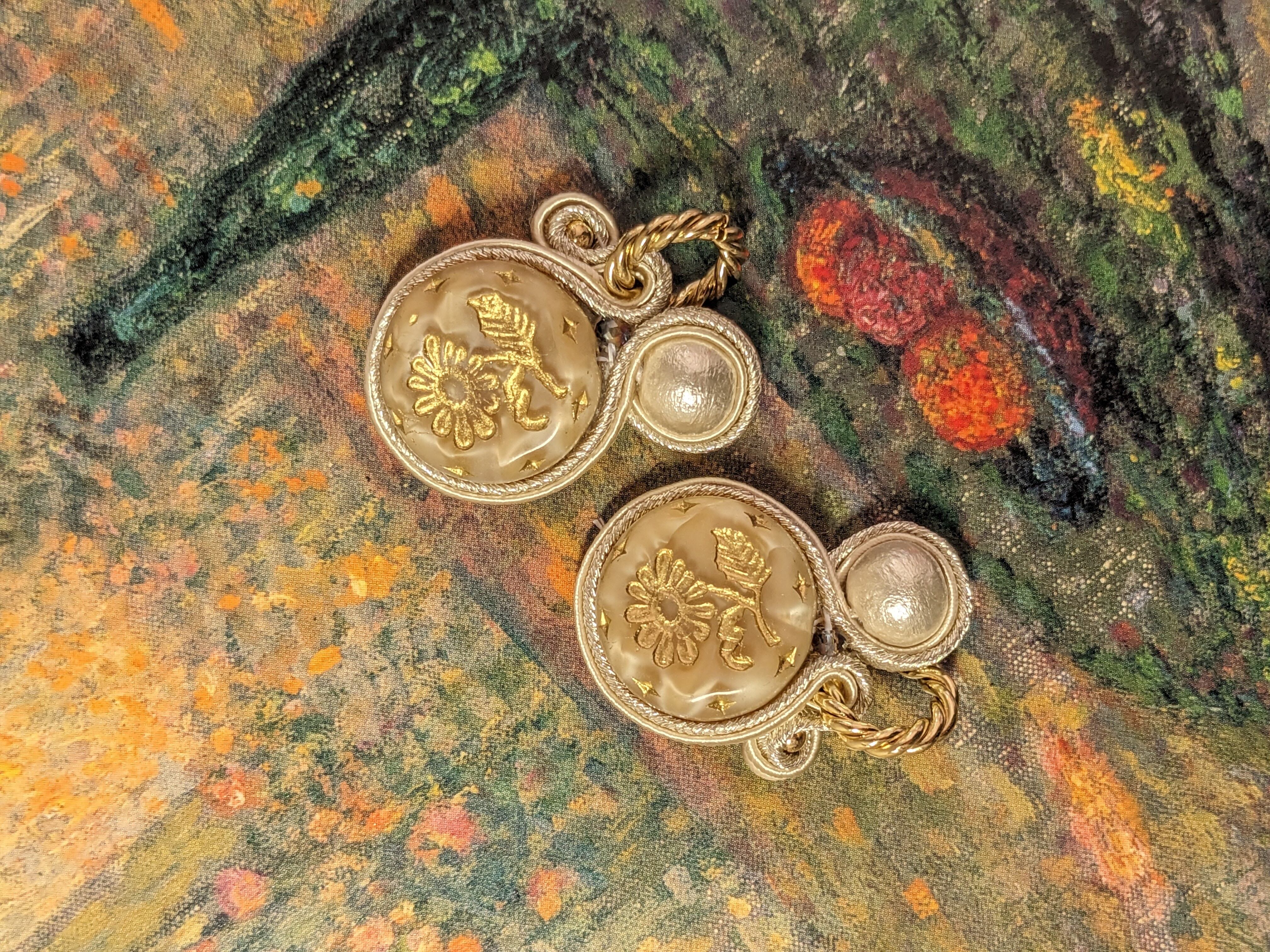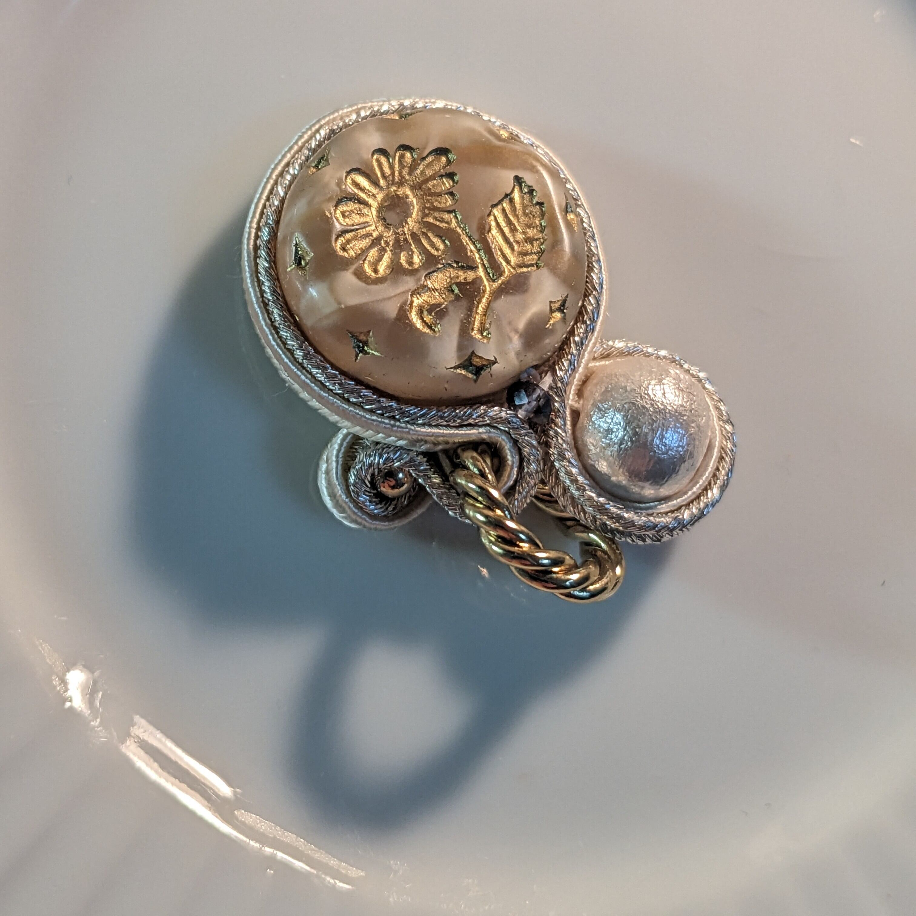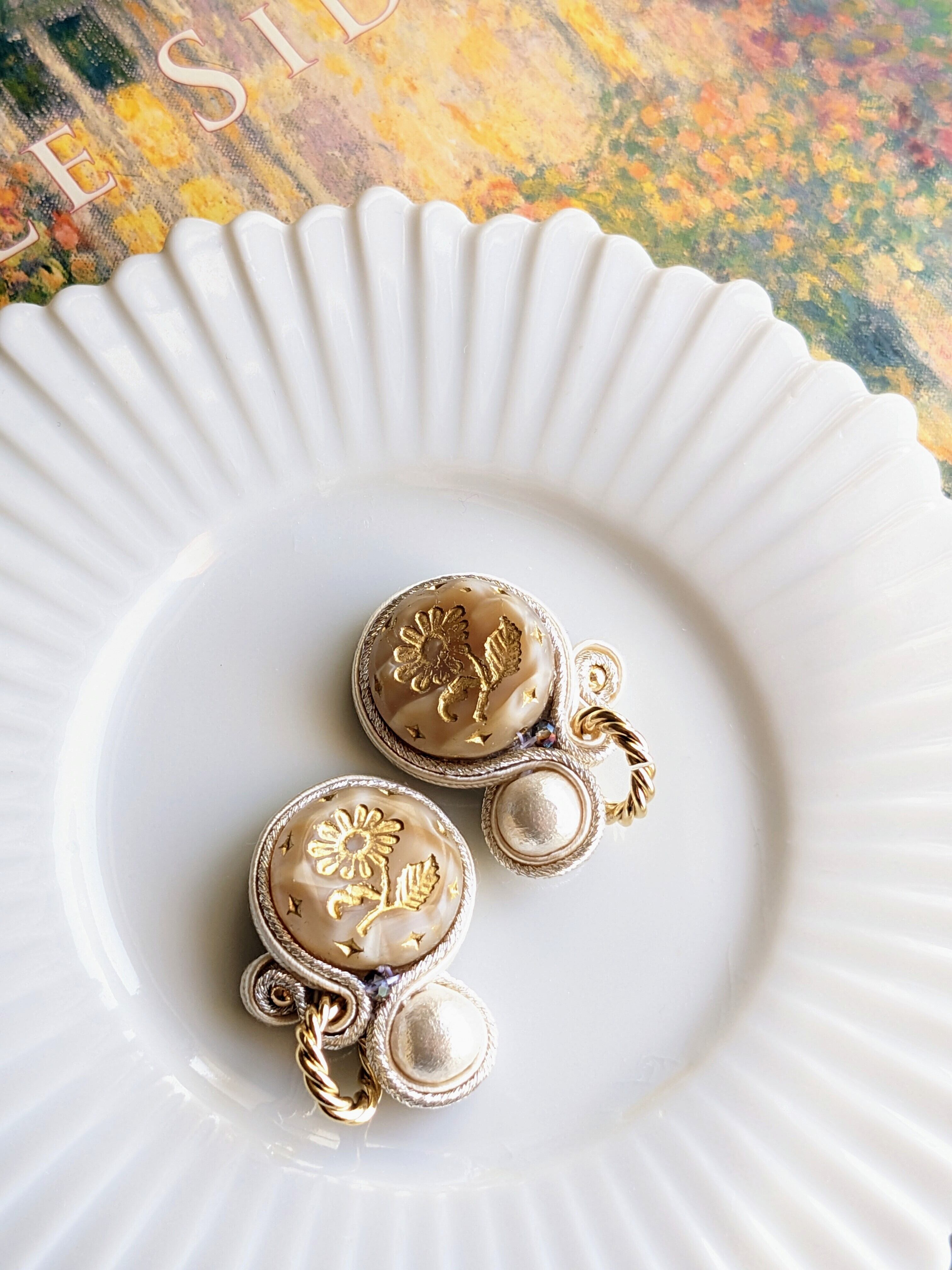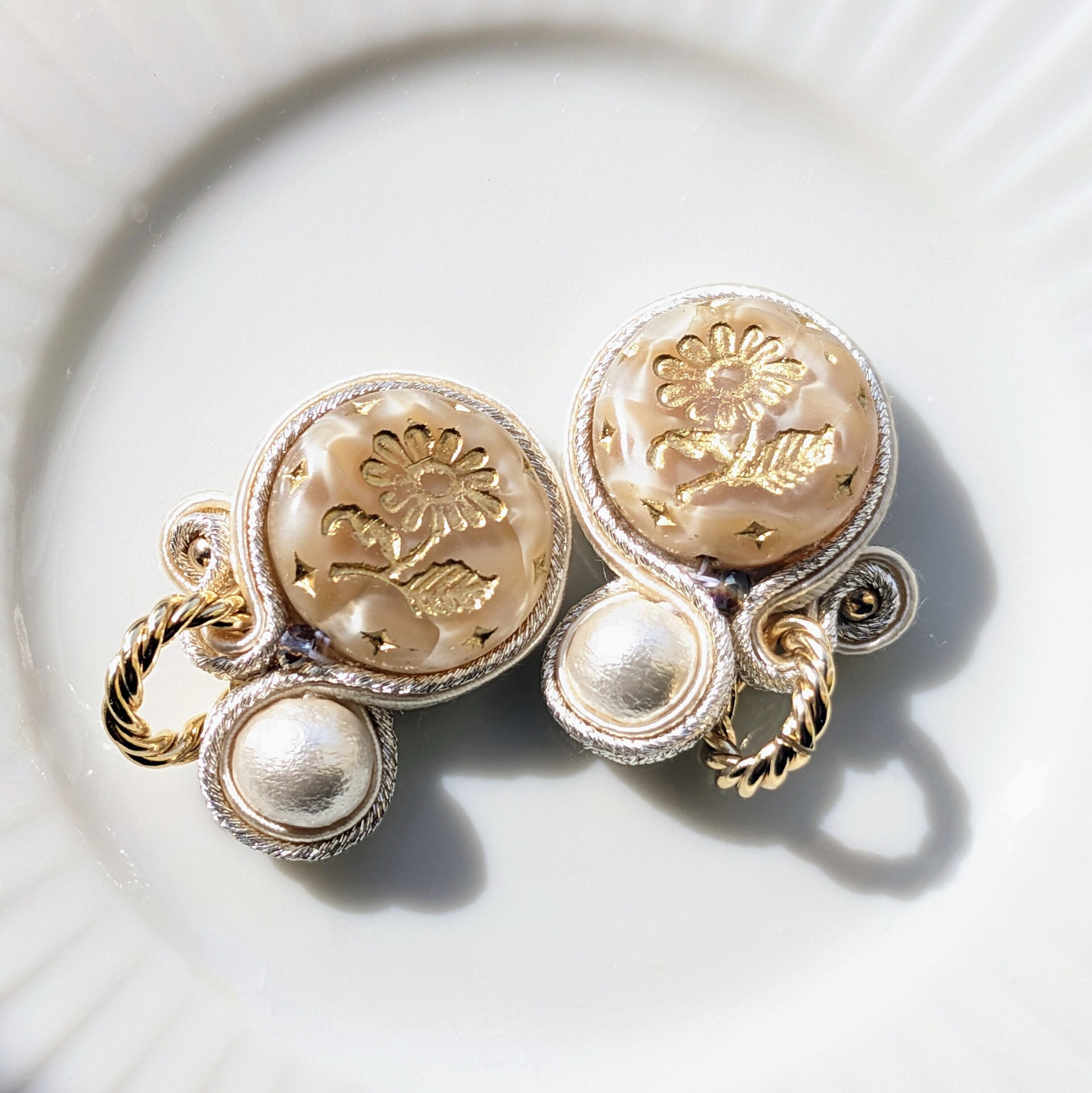 ◆トルコ・シリア支援チャリティ4週目です。支援の気持ちが一つずつ継がれて、しっかりと結ばれていくことを願い、ゴールドのスパイラル状の輪を括り付けました。ミルクティーカラーの花柄チェコビーズにコットンパール、コードはリネンカラーで優しくナチュラルな仕上がりです。