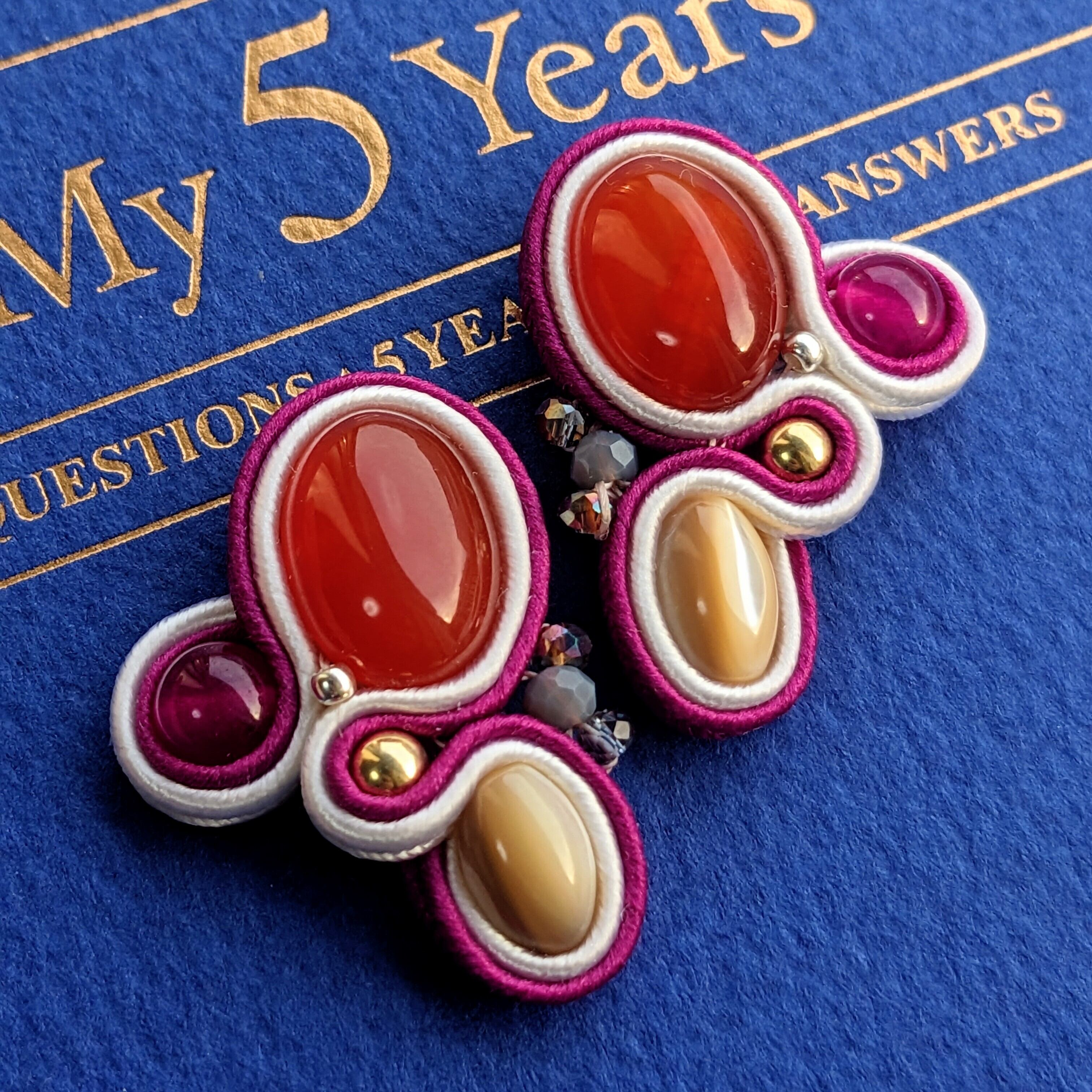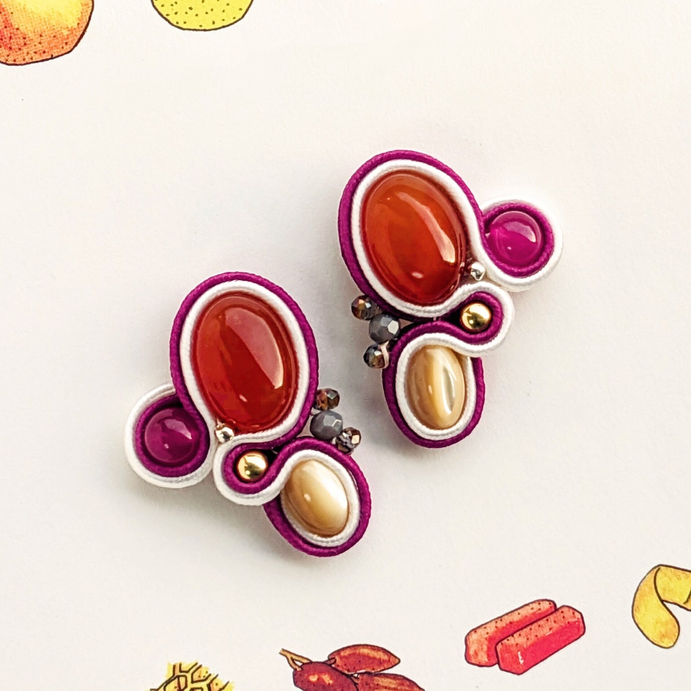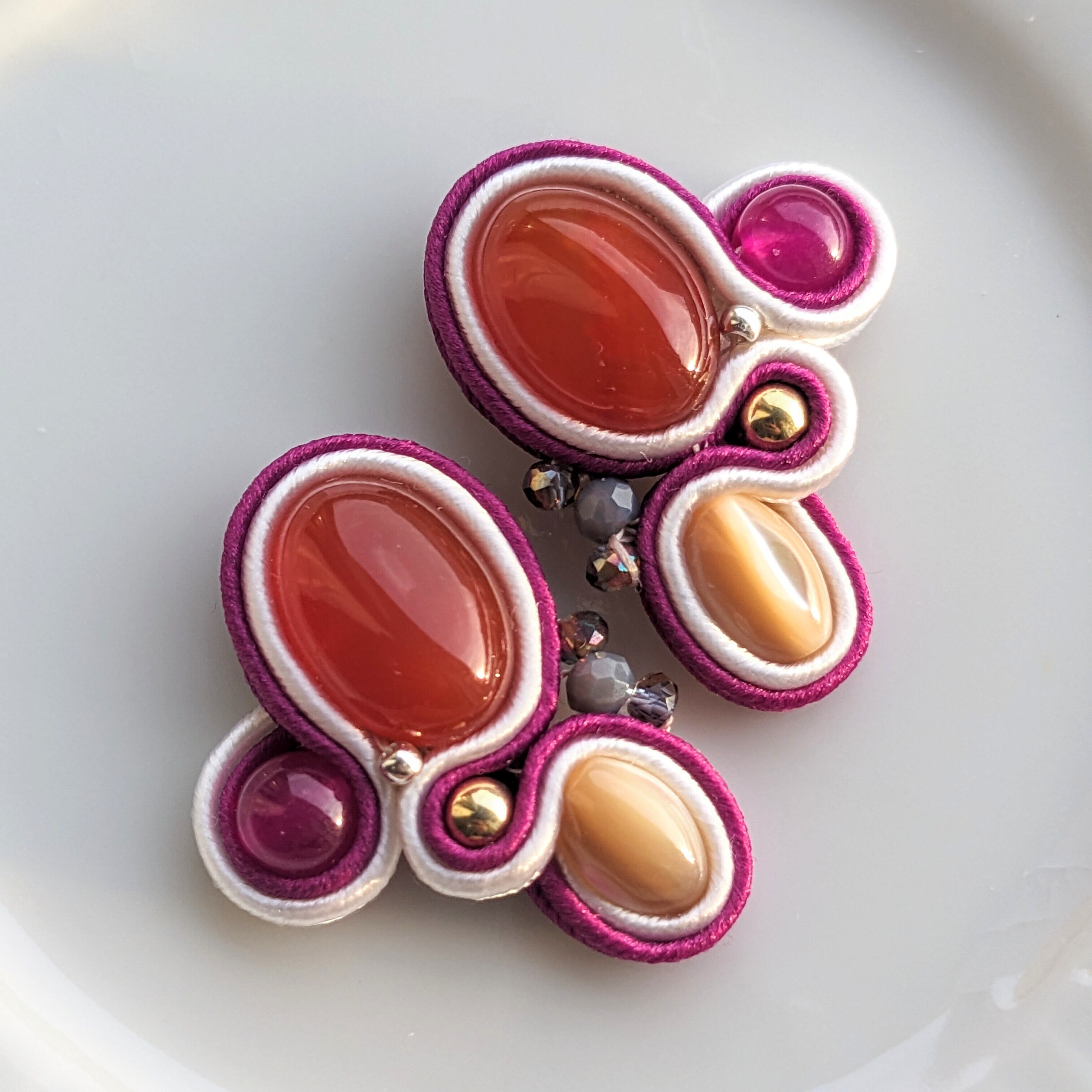 ◆ブラッドオレンジのような果汁感のある天然石カーネリアンをフューシャピンクのコードで包みました。横に控えるピンクのカルセドニーも、同色のコードと一体化してまとまりよくおさまっています。カーネリアンから滴り落ちる雫はつるりとした質感のマザーオブパール。華やかな艶と上品な色合いで、全体をほどよく落ち着かせてくれました。